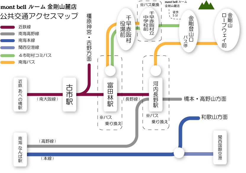 近鉄 富田林駅にてバス乗換 南海バス/4市町村コミバス「千早赤阪村立中学校前」バス停乗換 (※直通バスはありません。必ず乗換が必要になります。) 「金剛登山口」バス停下車 徒歩5分 または 近鉄 河内長野駅にてバス乗換 南海バス「金剛登山口」バス停下車 徒歩5分 |